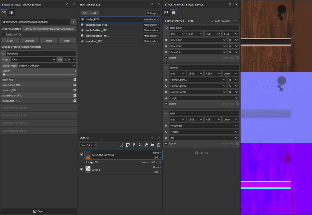 Stack N Pack is a plugin for Substance Painter 2018.2.2+. With a friendly UI, customize your export presets and quickly export your textures and even merge multiple texture sets together into a single image set, all without leaving Painter. Easy drag and drop install for both Windows, macOS, and Linux.