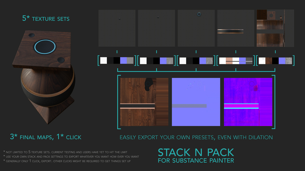 Stack N Pack is a plugin for Substance Painter 2018.2.2+. With a friendly UI, customize your export presets and quickly export your textures and even merge multiple texture sets together into a single image set, all without leaving Painter. Easy drag and drop install for both Windows, macOS, and Linux.